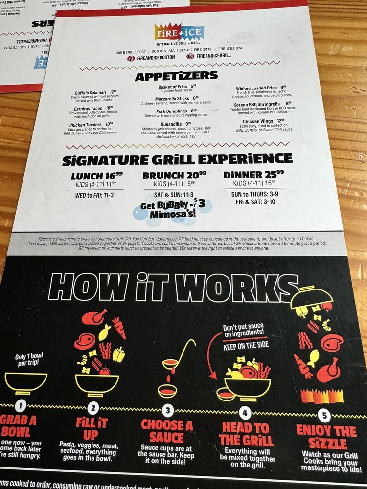 “ Fire + Ice is an AYCE hibachi grill type of place with many different options to choose from. The concept is you pick a small bowl and fill with items that can include your grains or noodles, vegetables, meats/seafood, and much more. Then you head to the sauce bar and choose a sauce or make a version of your own and add it into a small black container. Afterwards, you bring it to the grill and wait for it to be cooked in front of you hibachi-style. I was impressed by the large variety of noodles, veggies, and meats, but I was slightly underwhelmed by the sauce bar. I wish there were more Asian ingredients like soy sauce, chili oil, etc. but the premade sauces were not bad. I came in for the $18.99 lunch deal on a Wednesday and there were so few people there. Around 12pm too. I hope more people will give this place a chance and try it out, especially for lunch because of the good price. ”