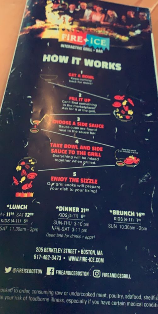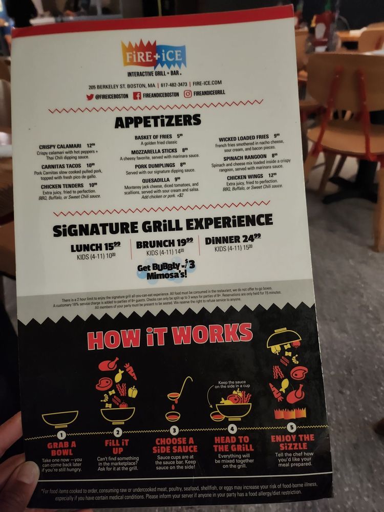 “ I have to say this place is my go to when I come in to the downtown Boston area I've been here several times and I'm always satisfied with the food and the service the fact that u can pick out the food u want cooked on the grill I highly recommend this place for sure if u visit the downtown Boston area fire and ice is definitely the first place u should stop by if u want some good freshly cooked food upon order they definitely deserve a five star ”