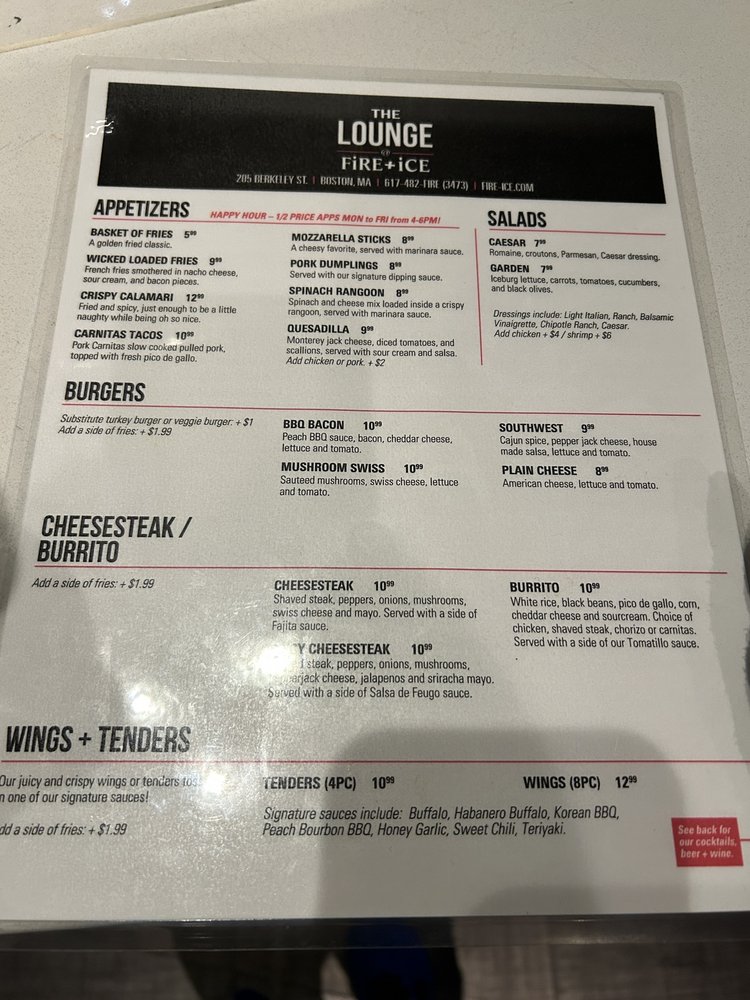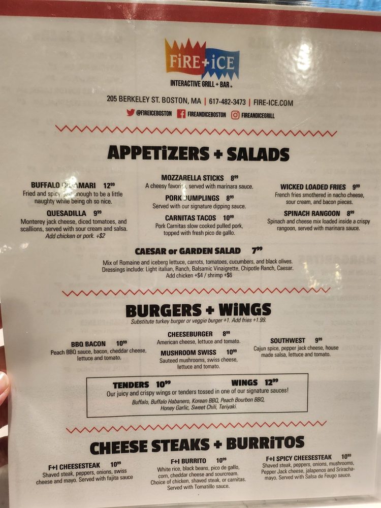 Welcome to Fire + Ice, a unique American dining experience located at 205 Berkeley St in Boston, MA. This restaurant offers a plethora of amenities such as taking reservations, offering delivery and takeout, and providing vegan and limited vegetarian options. Fire + Ice is wheelchair accessible, accepts credit cards and Apple Pay, and is perfect for casual dining.