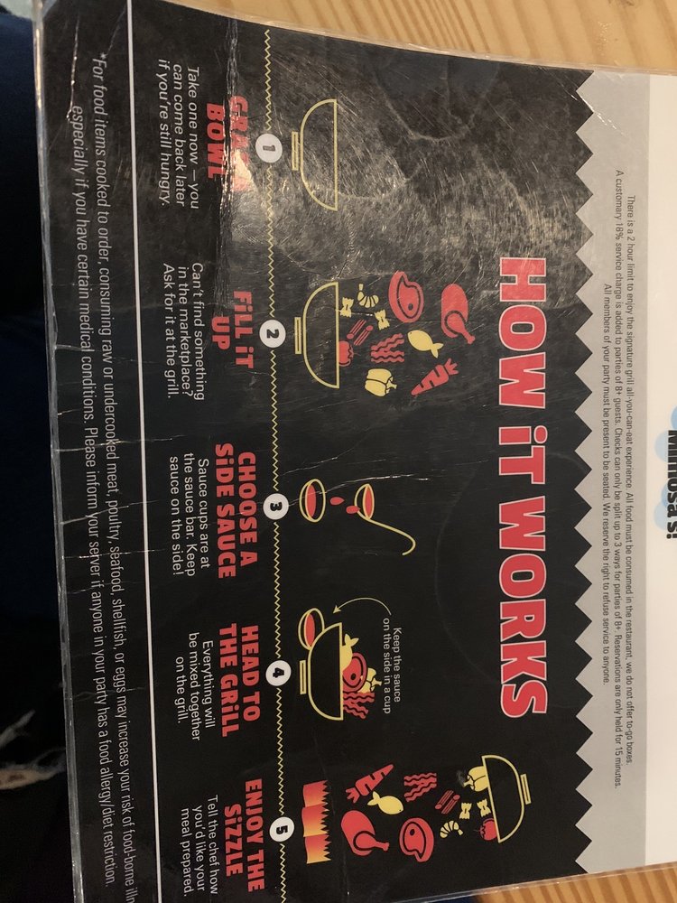 “ The concept of the restaurant is really cool. In short, you pay one price for all you can eat stir fry+more...so come hungry. Like a DIY buffet. They have different stations with raw ingredients which you grab your choices, then bring them over to the grill. From raw fish to noodles to vegetables, there's everything! Then you choose a sauce and bring that up as well. They have sauces from stir fry to mac n cheese sauce. Not only bowls, but you can have them make you burgers, steak and cheese subs, and other things like that. We got there 30 min to close but still was able to eat a lot and left full. However I suggest not doing that and giving yourself ample time so you're not rushing and can choose from everything. I will say too, I was overwhelmed from all of the choices, so don't be afraid to walk around and plan out your meals. I definitely over did it with portion sizes at first and ended up getting full way too fast. Also, be creative! Use the spices and toppings to really season your ingredients. I threw together basics but saw others around me really putting thought into their dishes which gave them a more elevated experience. They did have some suggestions on the wall of dishes you could create but I saw it too late. Overall cool concept and good price considering how much you can eat. ”