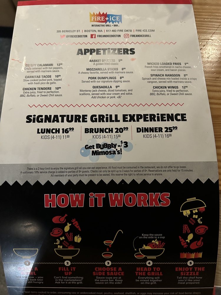 "Fire + Ice" is an American restaurant located in Boston, MA, offering a unique AYCE hibachi grill experience. Customers can select their own ingredients, sauces, and watch as their meal is cooked hibachi-style. Reviews praise the variety of options available, the quality of the food, and the attentive service. The restaurant also caters to vegan and limited vegetarian options, making it a versatile dining choice. With a casual atmosphere, full bar, outdoor seating, and entertainment options like pool tables, Fire + Ice is a popular spot for groups, families, and even dogs. Overall, the customizable dining experience and diverse menu offerings make Fire + Ice a must-visit destination in downtown Boston.